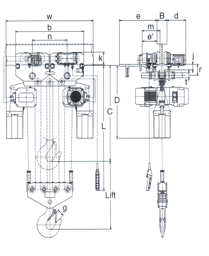 没有配供电电缆。关于供电方式,请于敝公司商量。 扬程(载重链)、按钮控制线、供电电缆的长度如在标准规格以外,请于敝公司商量。 载重链经过热处理,无法拼接使用,请注意。